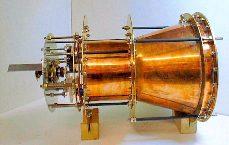 "L'appareil utilise un magnétron produisant des micro-ondes canalisées à l'intérieur d'une cavité résonante métallique à facteur de qualité élevé, en forme de cône tronqué offrant deux surfaces réflectives de superficies différentes, et muni d'un diélectrique résonant près du plus petit réflecteur. L'appareil génère une force en direction de la plus grande surface de la cavité."